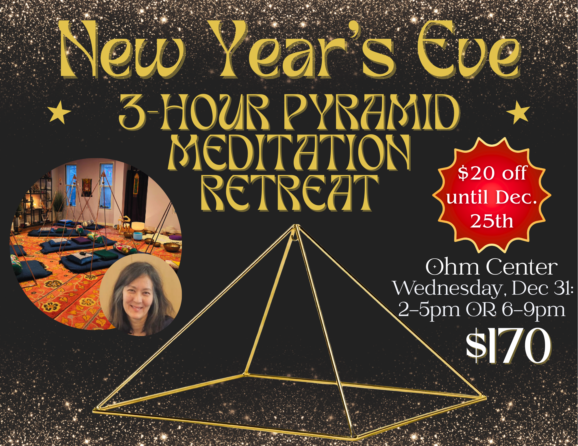 On the final day of the year, step beyond time and enter the stillness of the sacred. Within the energy portal and sacred geometry of your own copper pyramid, you’ll be guided through a powerful 3-hour inner journey to awaken higher frequencies of light and intention for 2026. Through reflection, sound healing, breathwork, chanting, and meditation, you’ll release the energetic residue of the past year and open to the subtle realms of renewal. Each participant will also receive a personal mini energy reading, offering insight and guidance for the path that lies ahead. The pyramid’s sacred geometric form amplifies energy and consciousness, creating a vortex of deep healing and expanded awareness…a rare opportunity to begin the New Year fully aligned with your inner being. Come dissolve into the stillness. Reconnect with your light and allow yourself to rise into 2026 radiant, renewed, and fully alive!