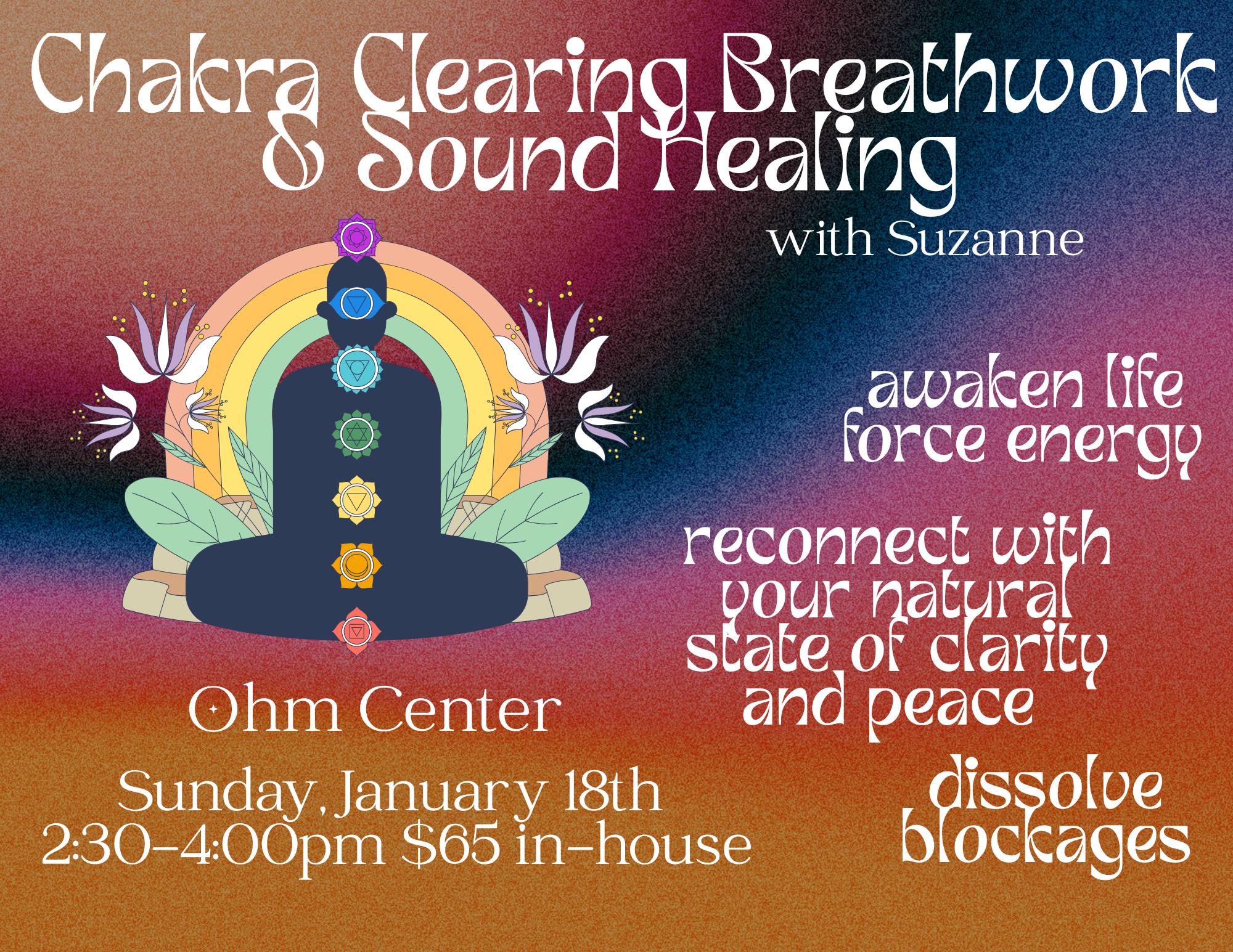 Join us for a deeply restorative class of Chakra Clearing Breathwork and Sound Healing at the OHM Center. Through guided breathwork, you’ll breathe the life force that flows through your chakras, which dissolves emotional blockages and negative thoughts which create energetic stagnation. After we get your inner channels open, the vibrations of crystal and Tibetan singing bowls will take you into a deeper state of clarity and peace. Leave feeling amazing!!