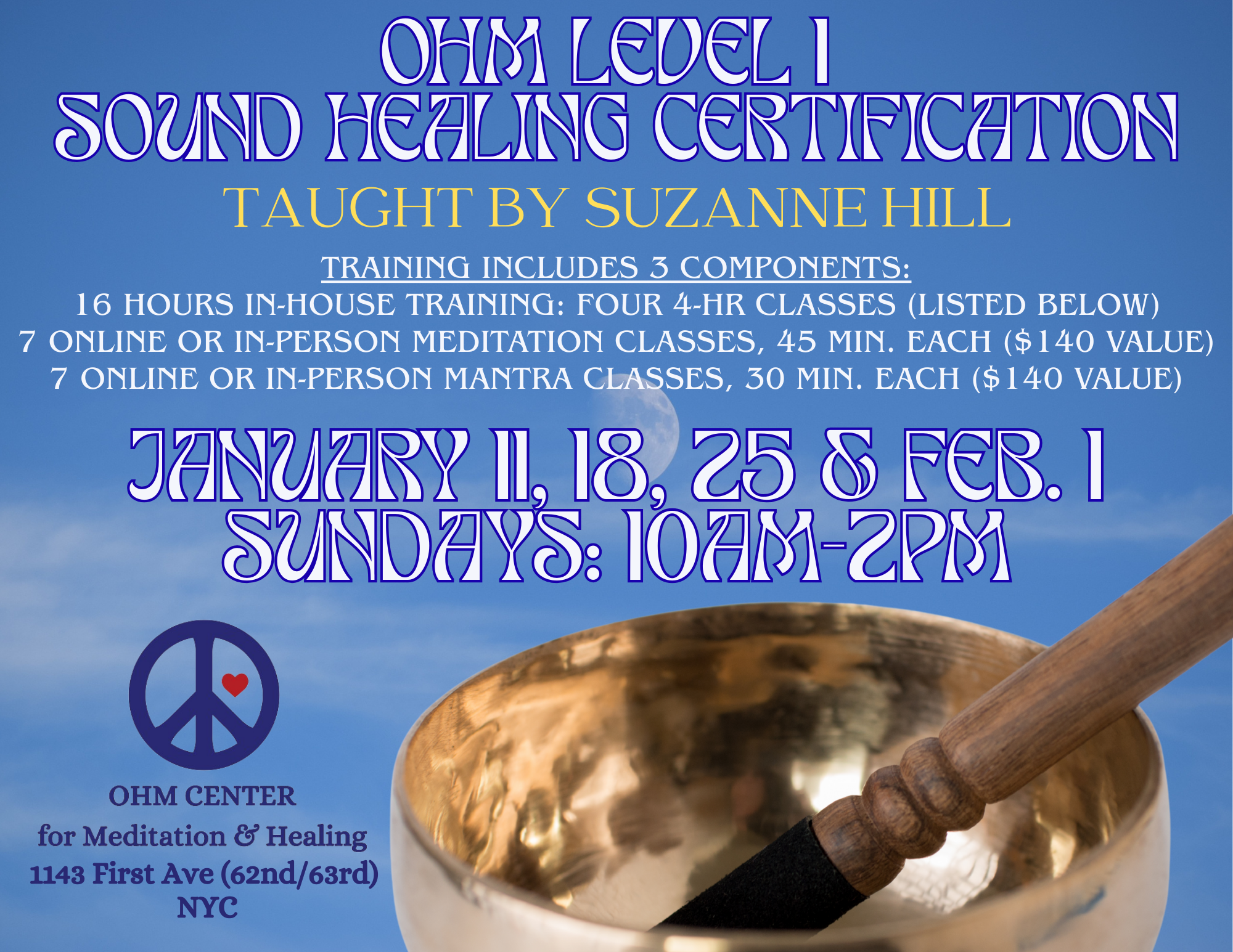 Founded by acupuncturist, healer and meditation teacher, Suzanne M. Hill, the OHM Center is dedicated to helping people evolve their meditation practice, wisdom training and self-love. Sound baths and sound healing is the key entry point for many!