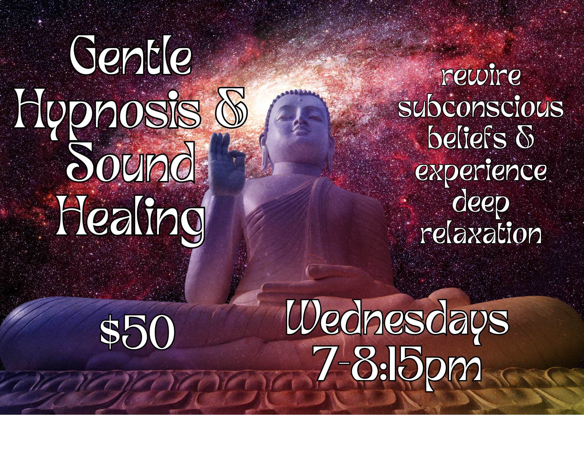 Enjoy this 75-minute class which incorporates gentle hypnosis followed by different types of sound healing and a 10-minute silent relaxation period. The inclusion of positive affirmations allows for deeper integration of new ideas & beliefs into your subconscious. This is a profoundly relaxing class. Good for anyone with anxiety, insomnia, depression or just plain stress. Led by Suzanne Hill. $50.