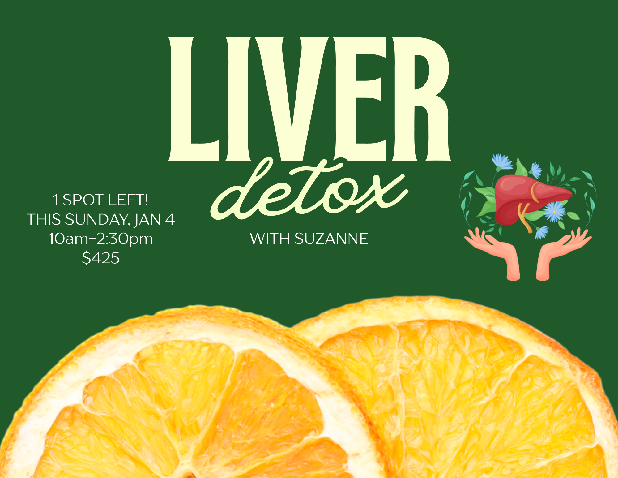 New year = new energy. If you’ve been feeling sluggish, inflamed, stuck, or “off,” this liver detox retreat is your opportunity to reset! Channel your New Year’s determination to create better health habits into joining us for an afternoon of cleansing. Plus here’s the secret that very few know about: this type of healing in a group setting majorly amplifies the potency of the results. Don’t miss out! The retreat includes: Detox Juices & Detox Teas Herbal formulas Ear Acupuncture Guided Relaxation Group Meditation Sound Bath Leave feeling supported with greater energy, clearer skin (especially helpful for acne sufferers), better digestion, and relief and prevention of chronic illness. Led by: Suzanne Hill, M.Sc., L.Ac. (Acupuncturist)