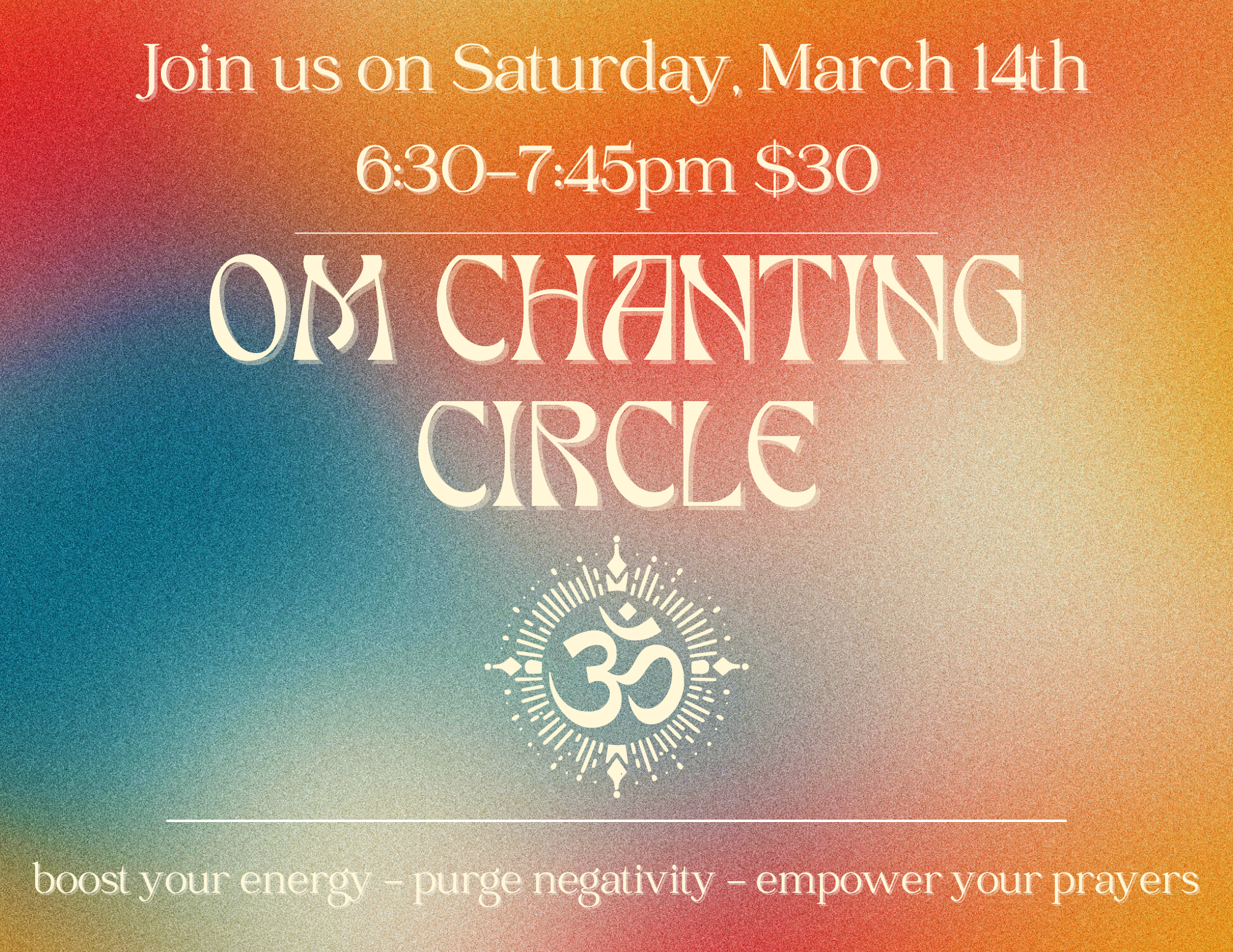 Join us while we chant “Om” for 45 minutes in 2 concentric circles. The inner circle faces outward, and the outer circle faces inwards. We switch seats 2 times so that everyone gets a chance to sit in the inner circle, where the energy is generated and elevates the frequency of the room. Write down your prayers and anything you want energized (project, relationship, idea, etc.) on a post-it and put in a bowl in the center. This supercharges whatever you have written down with energy. Lastly, you can also bring a bottle of water and put it in the circle for drinking later. We burn all post-its for you the next day to complete the process!