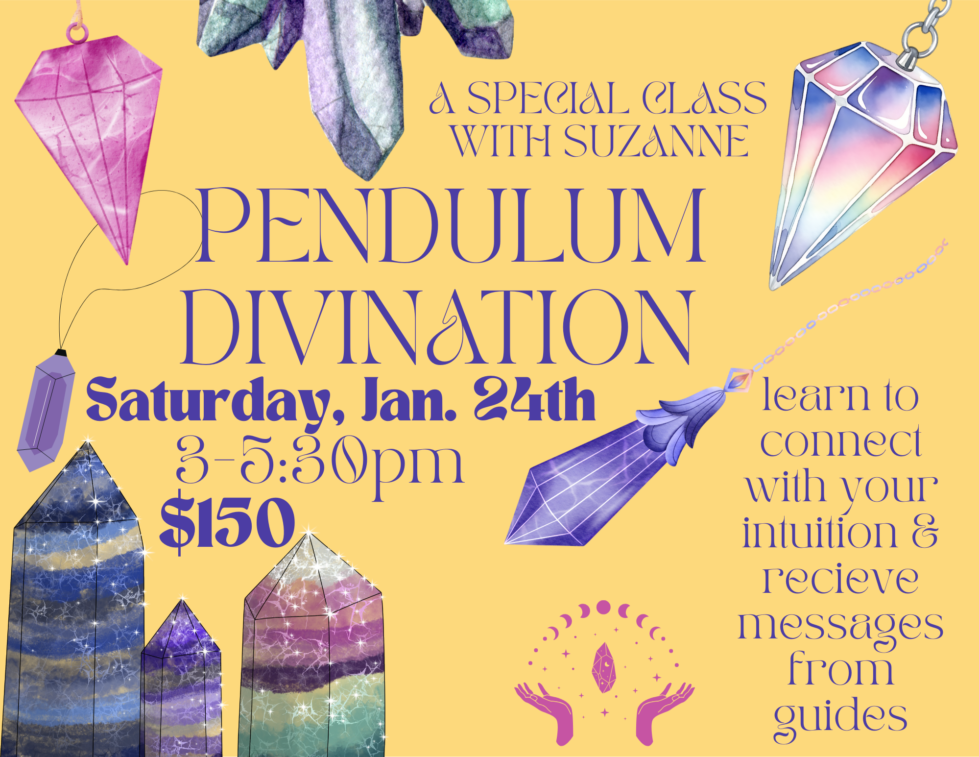 Super curious about how to use pendulum but the YouTube vides aren’t enough? Come learn to use one clearly, safely, and with real confidence. In this 2.5-hour experiential class, you’ll learn how to work with a pendulum as a practical tool for intuition, yes/no guidance, and simple energy-checking. You’ll leave knowing how to get accurate answers, how to not skew the answers to the questions you ask, and how to use your pendulum in different situations. This class is open to all levels and also perfect if you’ve tried a pendulum before but haven’t really honed your skill and still don’t trust your results. Taught by Suzanne, this class is SO FUN!!! And also super helpful, of course!