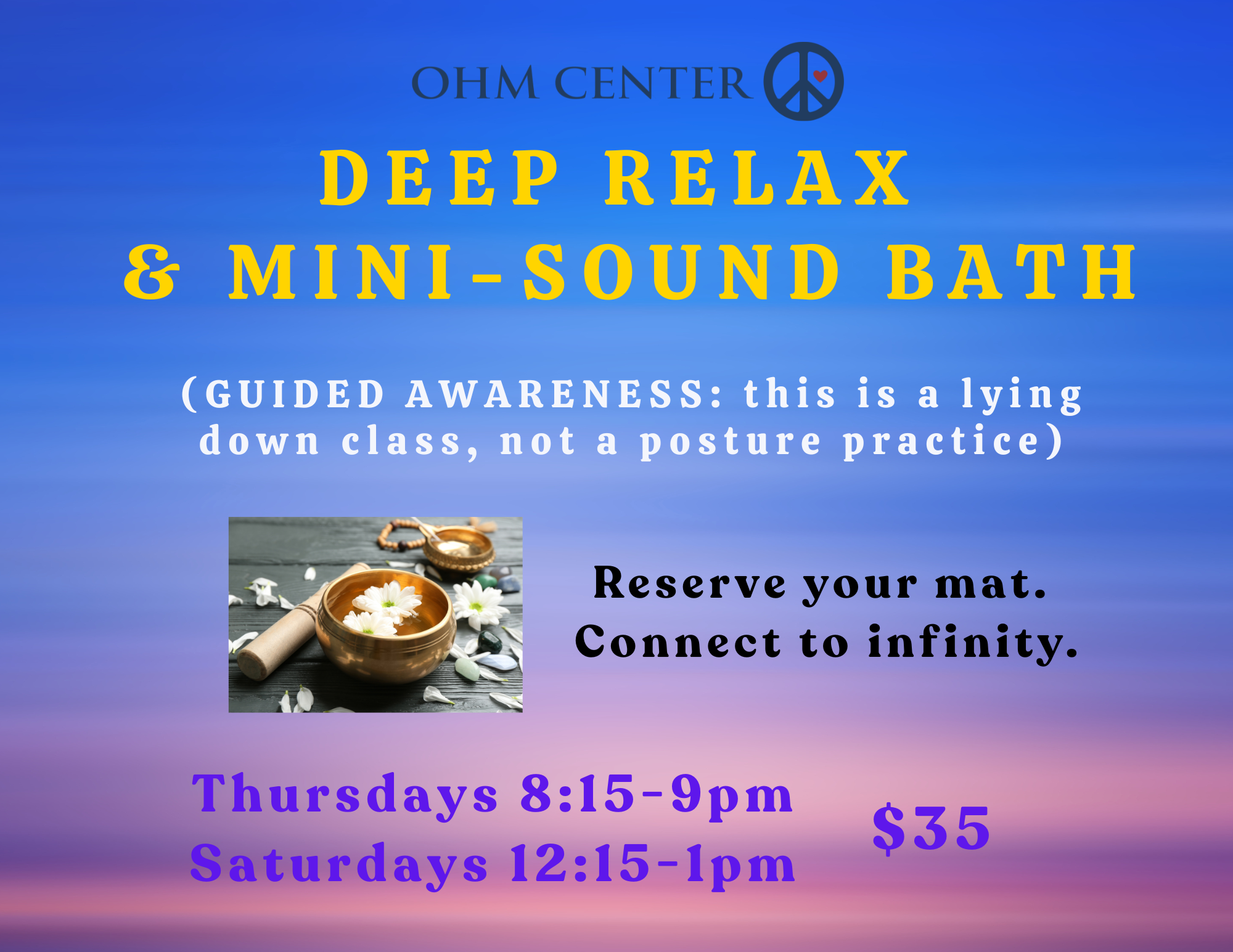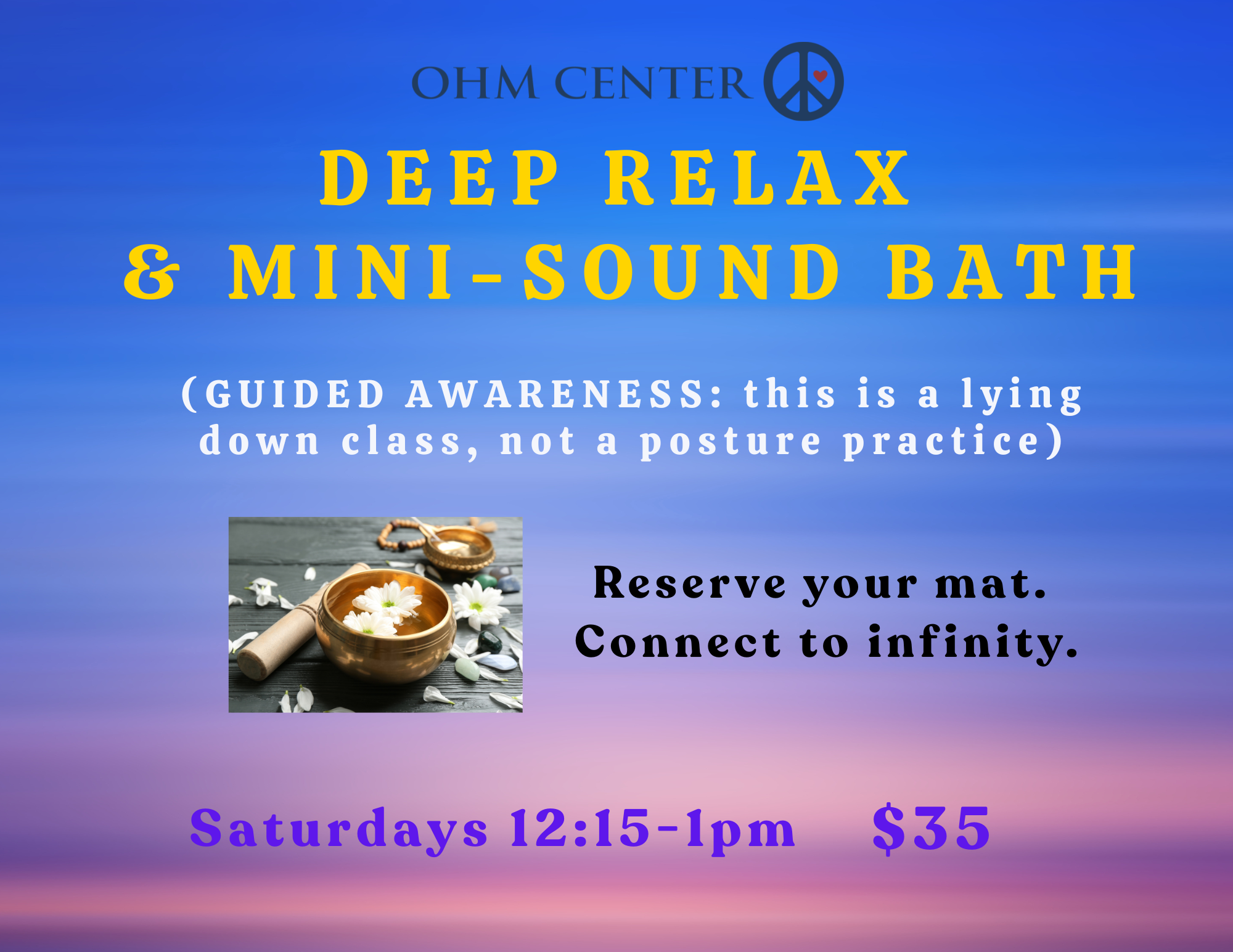 Having problems sleeping or relaxing? This class uses Yoga Nidra, otherwise known as Yogic Sleep, to teach you how to PROFOUNDLY relax. Come lie down on our comfortable futons in our beautiful meditation room, and follow the sound of the instructor’s voice until you feel your body release, let go, and experience a level of relaxation that you have not experienced to date! The class ends with a 5-minute Sound Bath for additional relaxation! Led by Suzanne or Ethan $35.