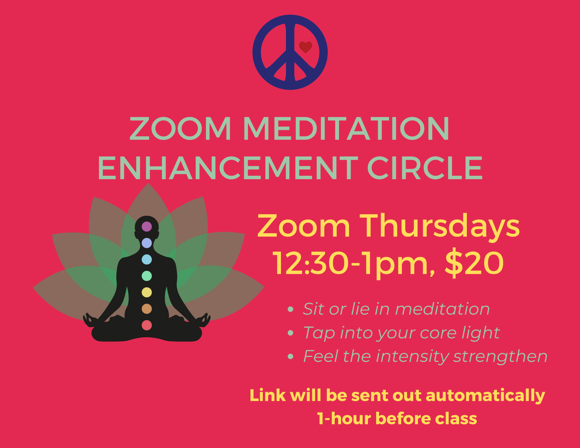 Includes In-House Meditation, Central Channel Meditation, Yoga Nidra, Theta Meditation Healing and 9pm Zoom Mantra classes. Meant to boost and support your daily practice.