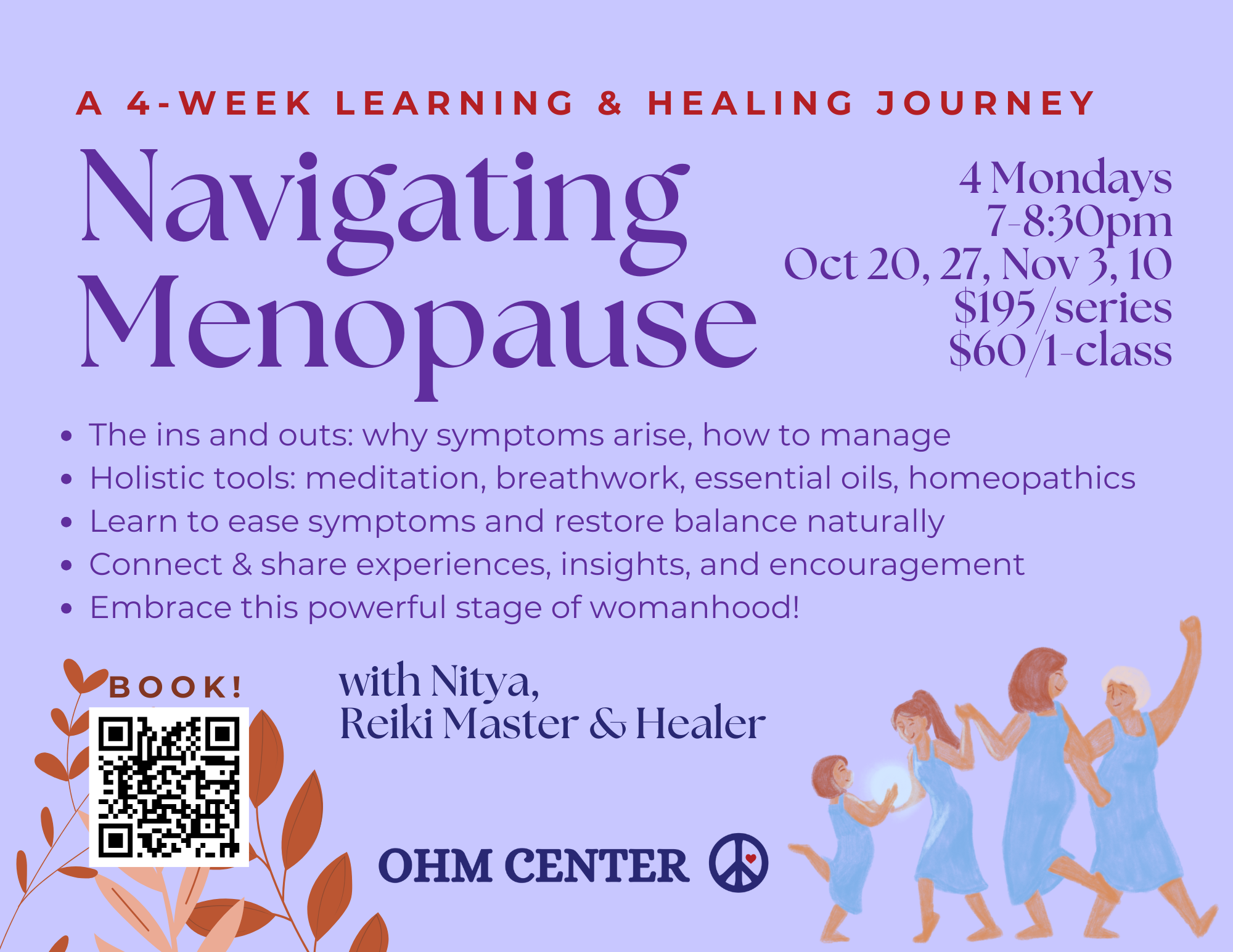 Join Nitya for a 4-week Menopause Support Series designed to empower, educate, and nurture you through one of life’s most transformative passages. Meeting Monday evenings from 7:00–8:30pm, this class blends education with experiential healing. You’ll learn what menopause really is, why your body is experiencing certain symptoms, and how to approach them with holistic remedies—from meditation, breathwork, and essential oils to homeopathics and integrative wellness practices. Each week also includes time for community sharing and connection, so you’ll feel supported, seen, and encouraged on your journey. Together we’ll create a safe space to explore, heal, and embrace this powerful stage of womanhood.