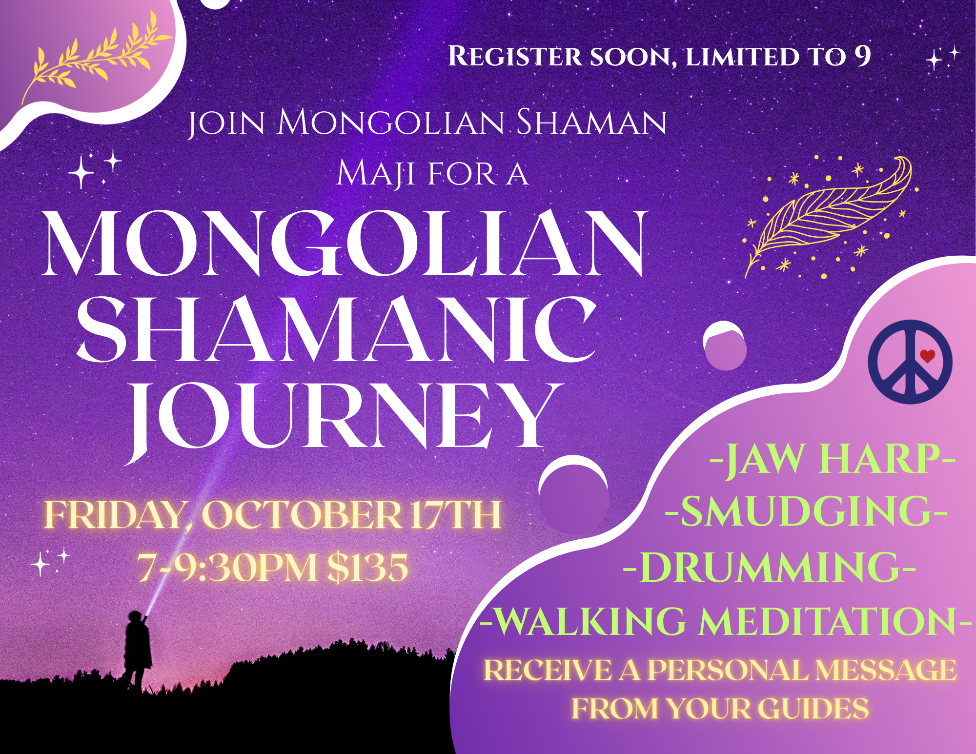 Join OHM’s resident Mongolian shaman, Maji, as she takes you through a journey of profound healing. Your experience includes a walking meditation, a beautiful jaw harp meditation, as well as drumming to clear your negative energies, and smudging for purification. You’ll also receive a personal message from your guides. It’s a magical evening, and an experience not to be missed!!