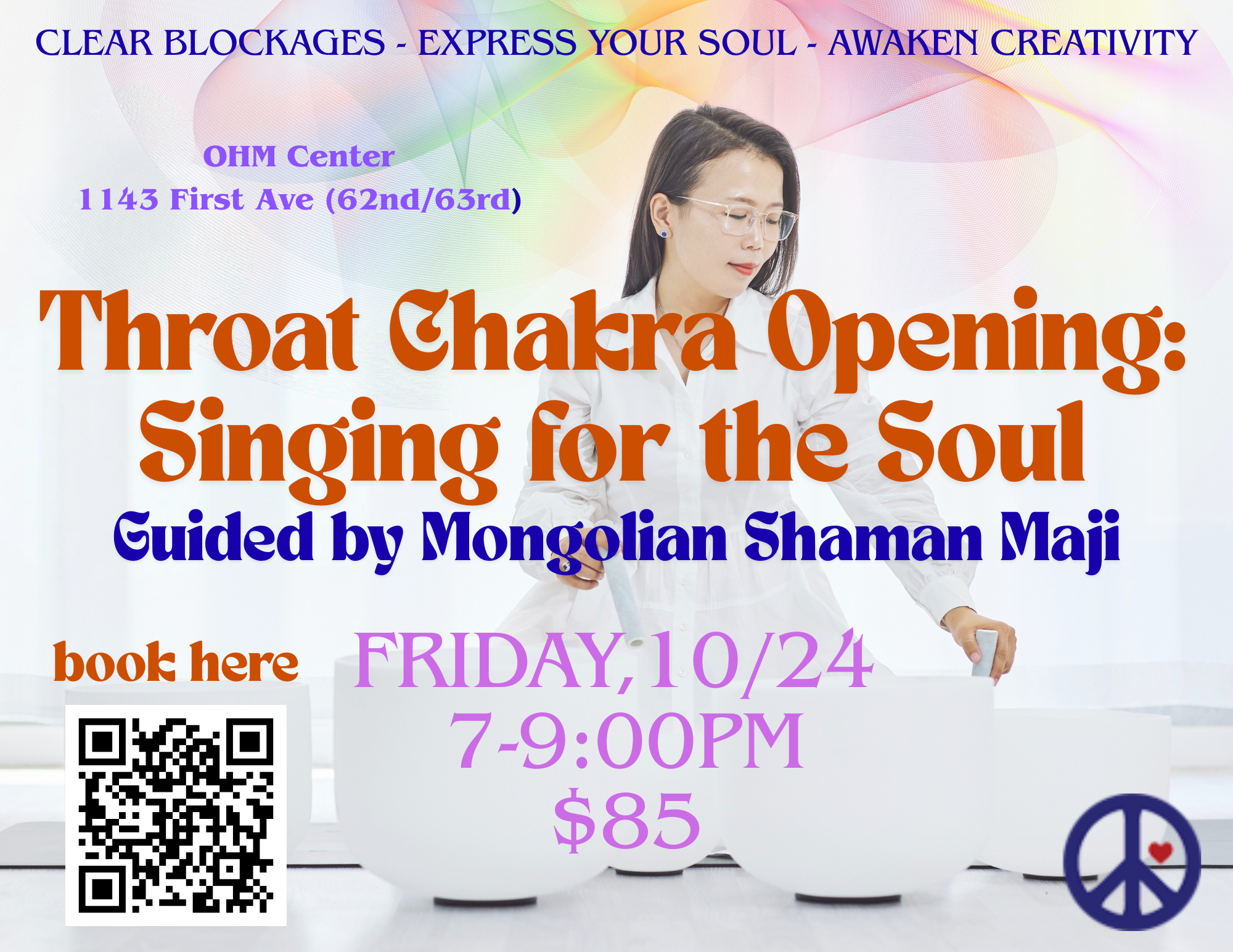 Come for the cathartic release of Kaitlyn’s Gong Bath (with our 40″ symphonic gong), followed by nurturing singing bowls to integrate the healing. All the while, Ethan will be channeling healing energy into the room. This all begins with Tibetan mantra chanting to cleanse and purify your chakras.