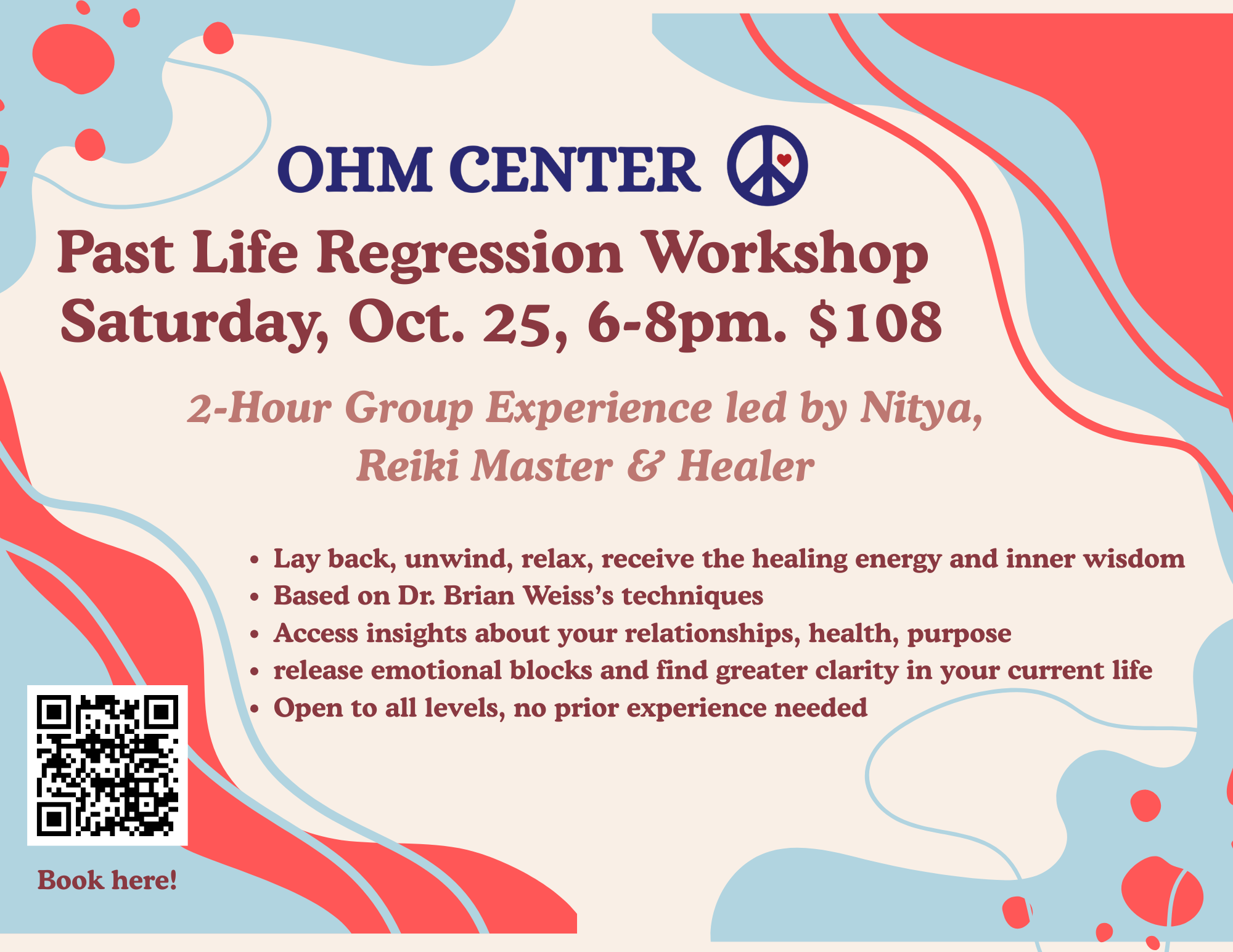Step into the mystery of your soul’s journey with Nitya’s Group Past Life Regression at Ohm Center. In this two-hour immersive experience, you’ll be gently guided through a deep hypnosis process inspired by the pioneering techniques of Dr. Brian Weiss. Using her expertise as a Reiki Master, energy intuitive, and transformational guide, Nitya creates a safe and sacred container where you can access memories, wisdom, and healing from beyond this lifetime. Whether you’re curious about the roots of current life patterns, seeking clarity on relationships, or ready to release long-held blocks, this journey can offer profound insights, emotional freedom, and a renewed sense of purpose. No prior experience is required—just an open mind and heart.